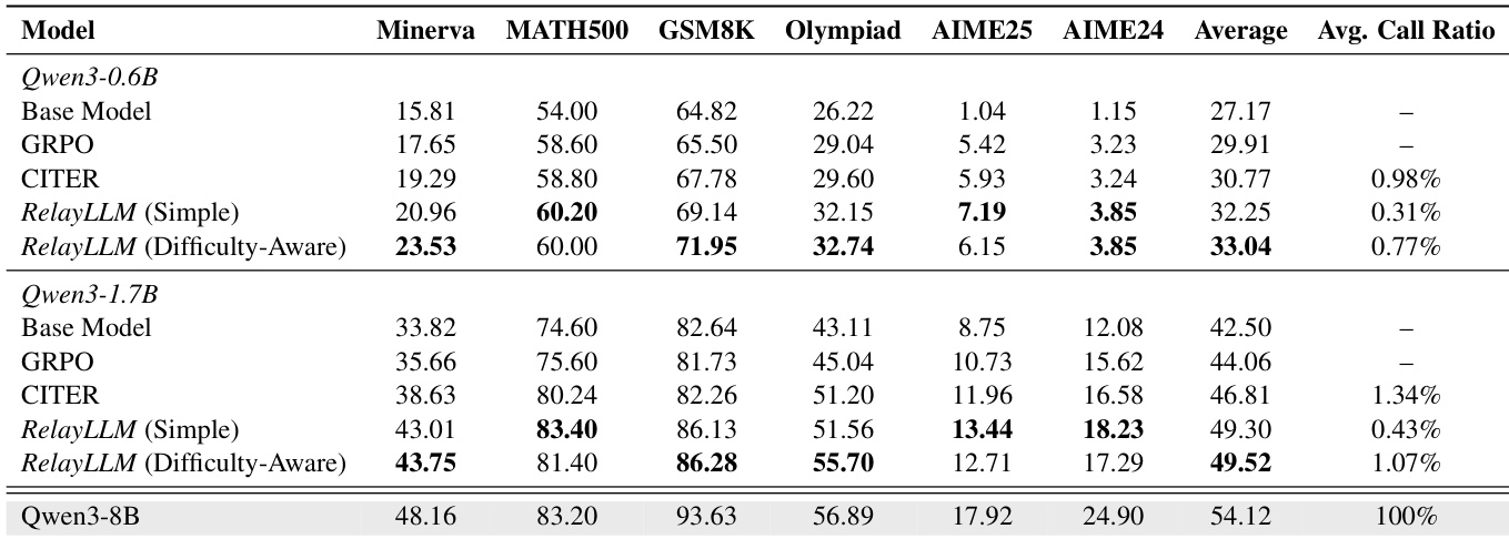 作者使用 Qwen3-0.6B 和 Qwen3-1.7B 作为学生模型,评估 RelayLLM,与 GRPO 和 CITER 基线在六个推理基准测试上进行比较。结果表明,RelayLLM 在基线模型上实现显著性能提升,并优于 CITER,其中难度感知奖励变体在保持低于 1% 的平均调用比例的同时达到最高准确率。