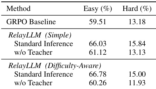 作者采用无教师评估,以评估 RelayLLM 的内在推理能力,结果显示,即使在无法访问教师的情况下,学生模型仍保留了改进的推理技能。结果表明,RelayLLM(简单奖励)在简单数据集上的准确率高于 GRPO 基线,表明知识转移有效;而在困难数据集上性能下降,表明其对复杂任务仍持续依赖教师。