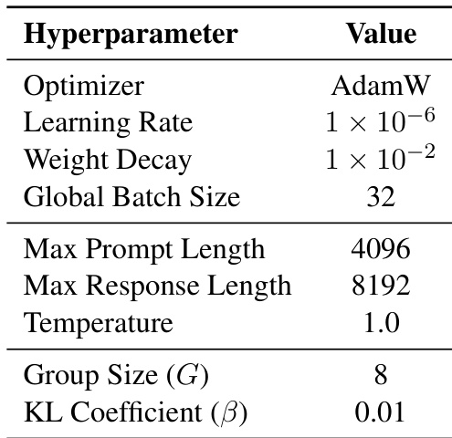 作者在后训练阶段使用 GRPO 算法,采用 AdamW 作为优化器,学习率为 1×1061 \times 10^{-6}1×106,权重衰减为 1×1021 \times 10^{-2}1×102。模型以全局批量大小 32、组大小 8、KL 系数 0.01 进行训练,以确保稳定性,采样时使用温度 1.0。