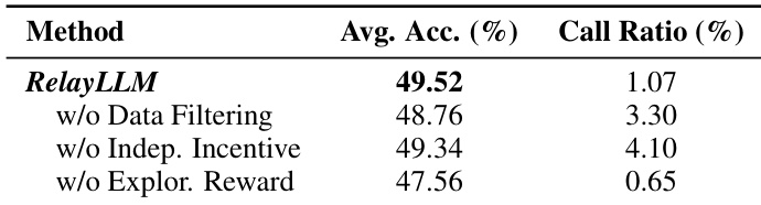 作者通过消融研究评估 RelayLLM 中关键组件的影响,结果显示,移除数据过滤会降低准确率并增加调用比例,表明其在避免浪费性交互中的重要性。移除独立性激励会导致调用比例升高,表明鼓励自立可提升效率。移除探索奖励会显著降低准确率,凸显其在不确定情境下触发求助的关键作用。