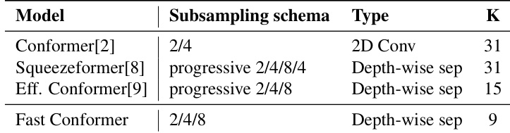 The authors leverage a redesigned Conformer architecture, termed Fast Conformer (FC), to achieve significant improvements in inference speed and scalability while maintaining competitive accuracy on speech processing tasks. The core of the redesign centers on a novel downsampling schema that increases the overall downsampling rate from 4x to 8x, thereby reducing the sequence length of the encoder output. This is achieved through a series of modifications to the initial sub-sampling block. The original Conformer employs a 4x downsampling module, which increases the frame rate from 10 ms to 40 ms. In contrast, Fast Conformer introduces three depth-wise convolutional sub-sampling layers to achieve an 8x downsampling, increasing the frame rate to 80 ms. This change reduces the computational and memory burden of the subsequent attention layers by a factor of 4, as they operate on a sequence that is 4x shorter. The sub-sampling block is further optimized by replacing the standard convolutional layers with depthwise separable convolutions, reducing the number of channels from 512 to 256, and decreasing the kernel size from 31 to 9. These modifications collectively contribute to a 2.8x speedup in encoder inference compared to the original Conformer. The overall framework of the downsampling process is illustrated in the figure below, which compares the sampling rates across different models.