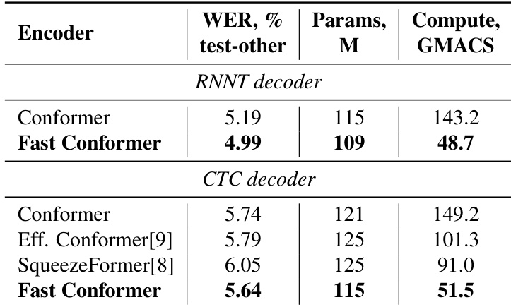 - Fast Conformer models achieved slightly higher accuracy than standard Conformer models and demonstrated a 3x improvement in compute efficiency, while also outperforming EfficientConformer and SqueezeFormer in speed.
