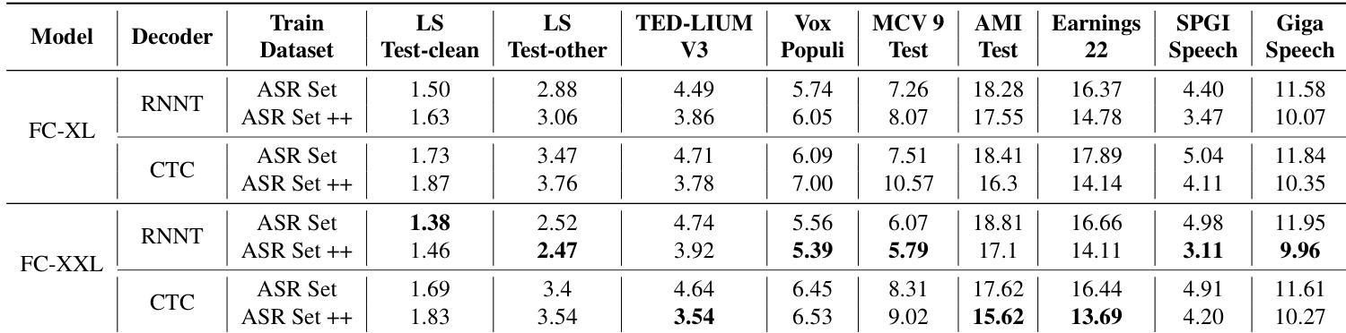 The authors evaluate Fast Conformer models FC-XL and FC-XXL on multiple ASR benchmarks, showing that FC-XXL achieves lower WER than FC-XL across most datasets, particularly on LS Test-other and MCV 9 Test. When trained on the augmented ASR Set++, FC-XXL further reduces WER on several benchmarks, demonstrating improved accuracy and noise robustness.