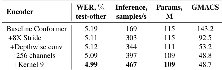 The authors evaluate the impact of architectural modifications on the Conformer encoder, showing that adding a kernel size of 9 reduces the WER on LibriSpeech test-other from 5.19% to 4.99% while increasing inference speed from 169 to 467 samples per second. These improvements are achieved with fewer parameters and lower compute requirements compared to the baseline Conformer.