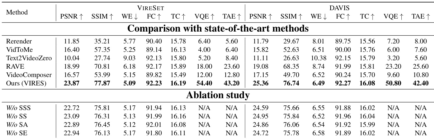 - Achieved state-of-the-art performance across five metrics: PSNR, SSIM, Warp Error (WE), Frame Consistency (FC), and Text Consistency (TC), outperforming VideoComposer, Text2Video-Zero, Rerender, VidToMe, and RAVE on both datasets.