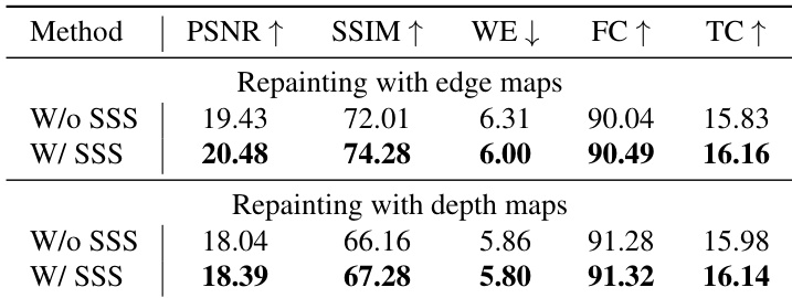 - Demonstrated generalization to edge maps and depth maps: SSS significantly improved performance with edge maps due to high-contrast transitions, but offered marginal gains with smoother depth maps.