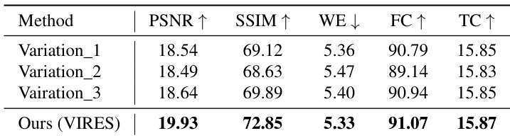 Results show that VIRES achieves the highest scores across all five metrics compared to the baseline variations, with the best performance in PSNR, SSIM, WE, FC, and TC. The authors use a standardized self-scaling method to extract condition features, and the results demonstrate that this approach significantly improves video editing quality over simpler alternatives.