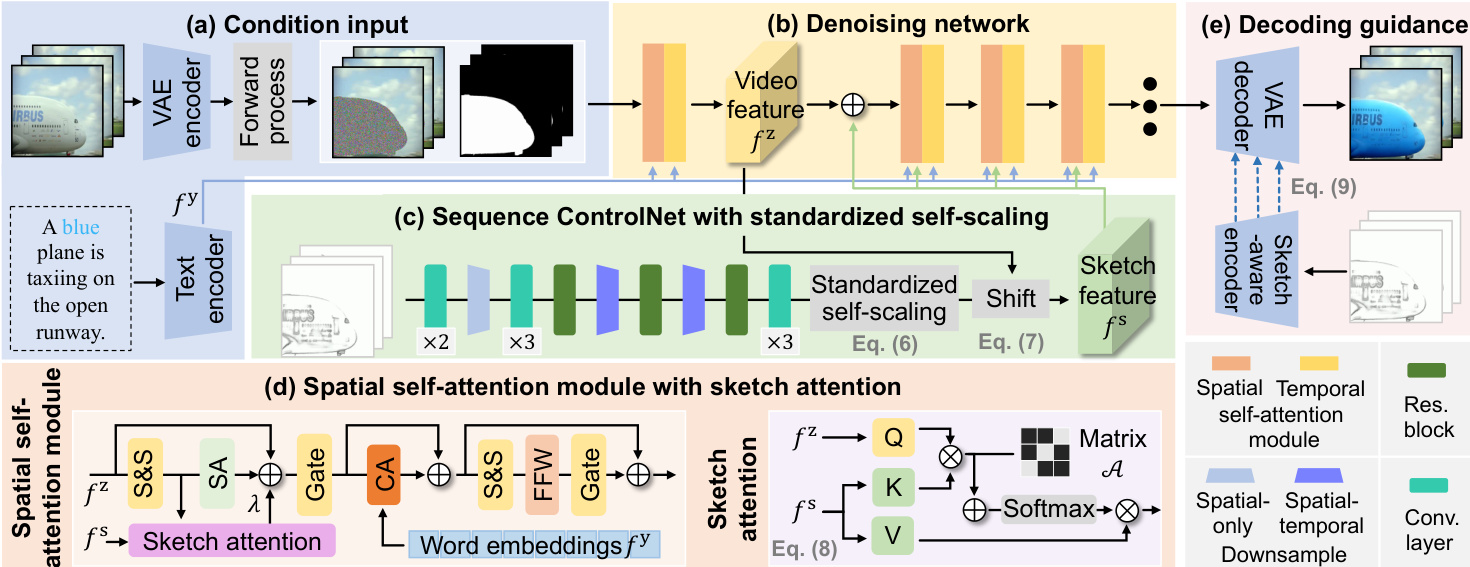 The VIRES framework operates as a conditional video generation system that repainted specific instances within a video clip using sketch and text guidance. The overall pipeline begins with input encoding, where the original video clip x is compressed into a latent representation z via a pre-trained spatial-temporal VAE encoder Ex. Concurrently, the sketch sequence s is processed by the Sequential ControlNet Fs to extract structural layouts, and the text description y is transformed into word embeddings fy using a pre-trained text encoder Fy. These conditioned features are then injected into the denoising network to guide the generation process.