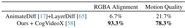 Results show that the proposed method combined with CogVideoX achieves significantly higher RGBA alignment at 93.3% and motion quality at 78.3% compared to the baseline method AnimateDiff + LayerDiff, which scores 6.7% and 21.7% respectively. This indicates that the proposed approach better aligns the alpha channel with RGB content while preserving motion quality.