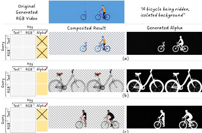 The authors leverage diffusion transformer (DiT)-based text-to-video models to enable RGBA video generation—producing videos with transparent alpha channels—while preserving the high-quality RGB generation capabilities of pretrained models. This is critical for visual effects in gaming, VR, AR, and film, where transparent elements like smoke, glass, or reflections must seamlessly integrate into scenes. Prior approaches either relied on post-hoc video matting, which struggles with generalization and temporal consistency, or used separate RGB-first and alpha-prediction pipelines that suffer from poor alignment and limited data. These methods are further constrained by the scarcity of RGBA video datasets, with only around 484 videos available. The authors’ main contribution is TransPixeler, a method that extends DiT models with alpha-specific tokens and a novel alpha channel adaptive attention mechanism. By using LoRA-based fine-tuning focused only on alpha-related projections and carefully designing attention interactions—such as enabling RGB-to-alpha attention while removing text-to-alpha attention—they achieve strong RGB-alpha alignment with minimal parameter updates. This allows high-fidelity, diverse RGBA video generation from text, even with limited training data, effectively bridging the gap between RGB-only models and the demands of advanced visual effects.