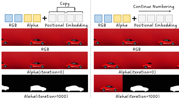 The proposed method, TransPixeler, introduces several key modifications to the base DiT architecture to enable the generation of alpha channels. First, the input sequence length is doubled to accommodate both RGB and alpha video tokens. The original L video tokens are used to generate the RGB video, while a new set of L alpha tokens is appended to generate the alpha video. This sequence extension is illustrated in the framework diagram. To ensure the model can effectively learn the distinct characteristics of the two domains, the positional encoding function is modified. Instead of assigning unique positional indices to RGB and alpha tokens, the method shares the same positional encoding for both domains. This is achieved by reinitializing the positional embedding for alpha tokens using the same positional indices as the corresponding RGB tokens, with an additional learnable domain embedding d to differentiate the two modalities. This design choice helps to minimize spatial-temporal alignment challenges during the initial training phase, accelerating convergence.