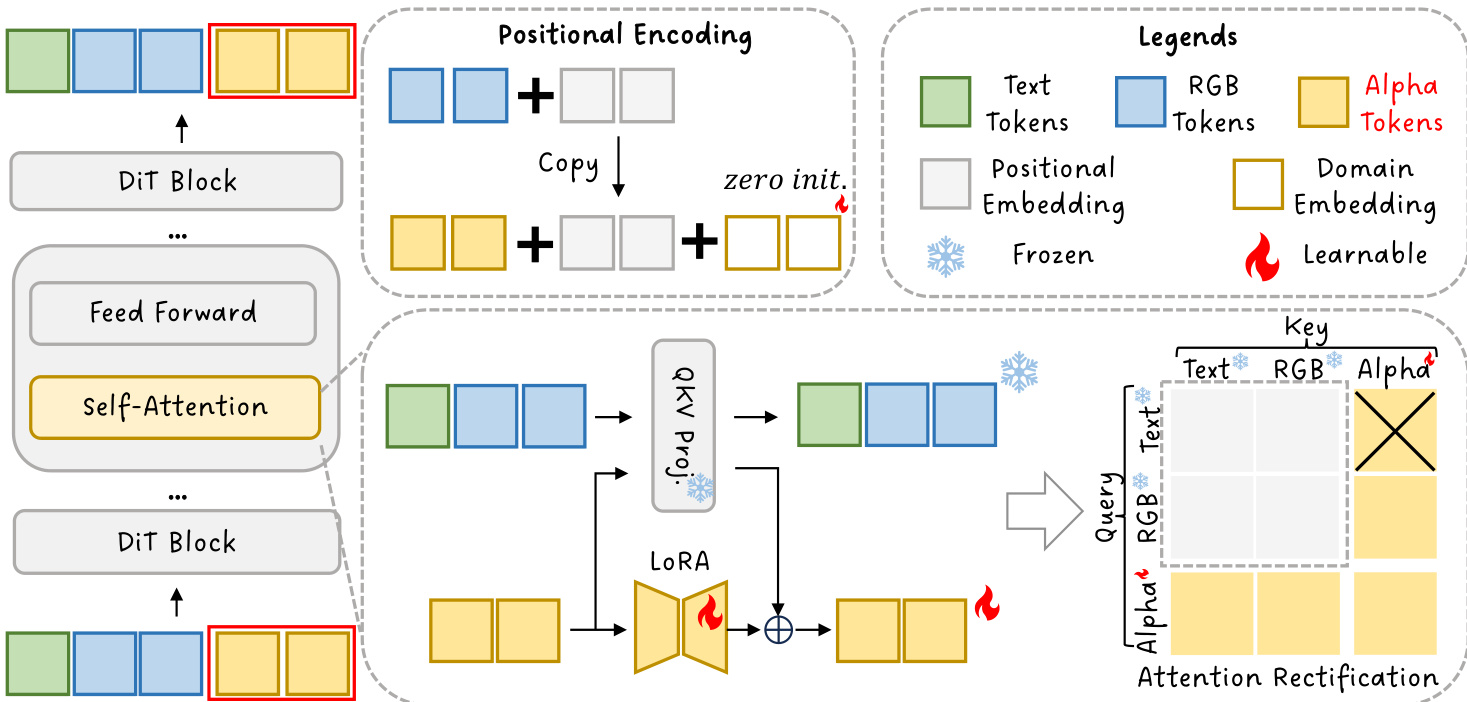 - The method introduces alpha-specific tokens and a modified attention mechanism that preserves RGB generation quality while enabling bidirectional alignment between RGB and alpha channels, with LoRA-based fine-tuning applied only to alpha-related projections to minimize interference.
