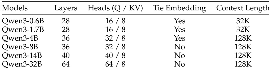 The authors use the provided table to detail the architectural specifications of the Qwen3 series models, showing that model size increases with layers, heads, and context length. The table indicates that Qwen3-0.6B and Qwen3-1.7B have tie embedding and 32K context length, while larger models from Qwen3-4B to Qwen3-32B use 128K context length and do not employ tie embedding.