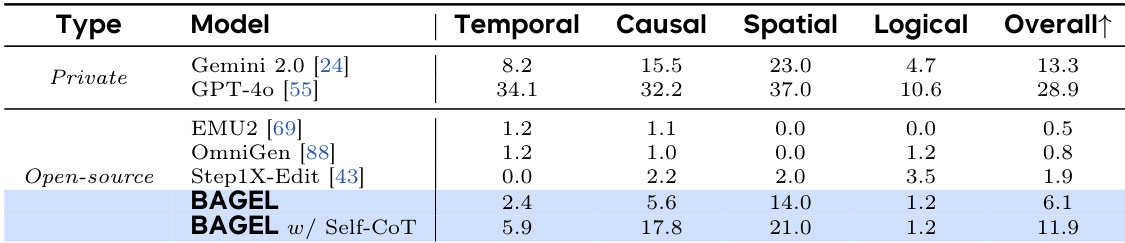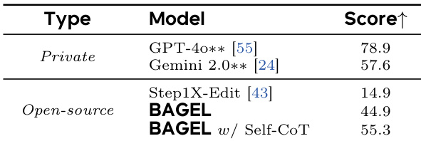The authors compare the performance of BAGEL and other models on the IntelligentBench evaluation suite, which assesses complex multimodal reasoning in image editing. Results show that BAGEL achieves a score of 44.9, while the enhanced version with self-generated chain-of-thought reasoning (BAGEL w/ Self-CoT) attains a significantly higher score of 55.3, outperforming all open-source models and approaching the performance of private models.