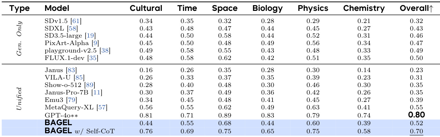 The authors compare the performance of various models on multimodal understanding benchmarks, with BAGEL and its variants achieving higher scores than specialized generation models and other unified models. BAGEL w/ Self-CoT achieves the highest overall score of 0.70, significantly outperforming the standard BAGEL model and other state-of-the-art models, indicating that reasoning enhances multimodal understanding capabilities.