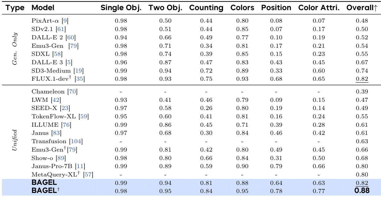 • On GenEval, BAGEL achieved 88% score, surpassing specialized models (FLUX-1-dev: 82%, SD3-Medium: 74%) and unified models (Janus-Pro: 80%, MetaQuery-XL: 80%).