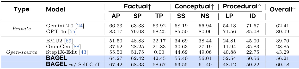 The authors compare BAGEL with private models and open-source models on the KRIS-Bench, evaluating performance across factual, conceptual, and procedural reasoning tasks. Results show that BAGEL achieves the highest overall score among open-source models, with a significant improvement when using self-CoT reasoning, particularly in procedural and conceptual reasoning.