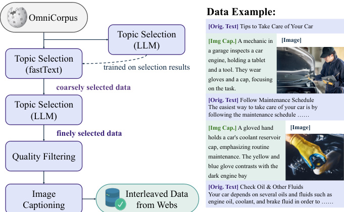 • Web data is built on OmniCorpus, a large-scale collection from Common Crawl, enriched with open-source image editing datasets to provide structured, interleaved text-image content.