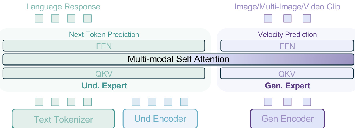 The authors leverage a Mixture-of-Transformer-Experts (MoT) architecture to unify multimodal understanding and generation within a single model, enabling seamless interaction between the two modalities. As shown in the framework diagram, the model employs two distinct transformer experts: an understanding-oriented expert and a generation-oriented expert. These experts operate on the same token sequence through shared self-attention operations at every layer, eliminating the need for bottleneck connectors and allowing for long-context interaction between understanding and generation processes. This bottleneck-free design facilitates the scaling of training data and steps, enabling the model's full capacity signals to emerge without architectural constraints.