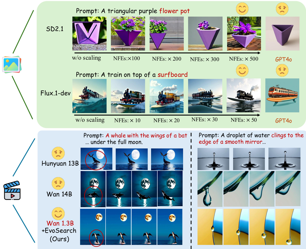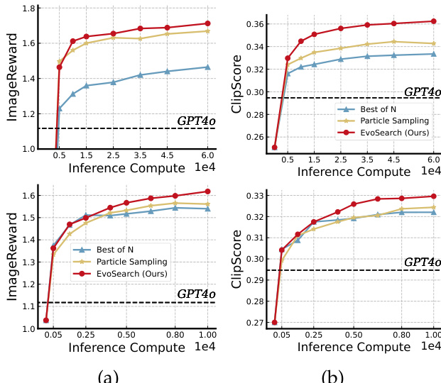 - EvoSearch enabled smaller models to surpass larger ones: SD2.1 with EvoSearch outperformed GPT4o under 30 seconds inference time, and Wan 1.3B with 5× scaled computation matched or exceeded Wan 14B’s performance on equivalent hardware.