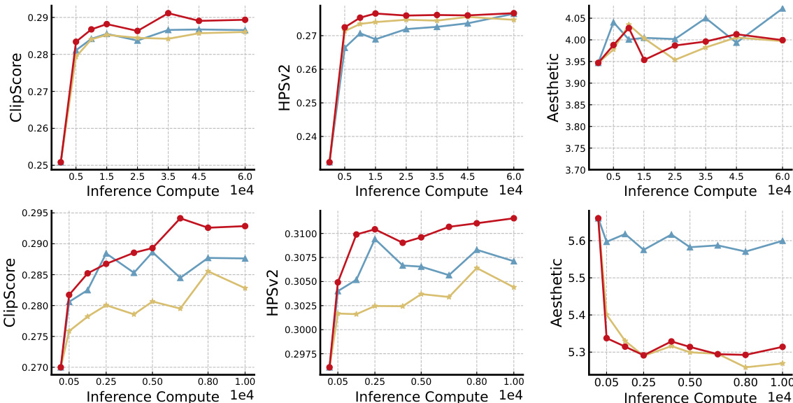 - EvoSearch demonstrated monotonic performance gains with increasing inference-time computation (NFEs), outperforming baselines that plateaued after ~1e4 NFEs, particularly on the 12B Flux.1-dev model.
