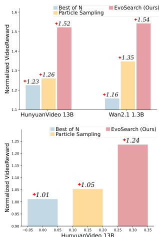 - On DrawBench, EvoSearch achieved superior performance over baselines (Best-of-N and Particle Sampling) across both diffusion and flow models, with improvements of up to 32.8% and 14.1% on Wan 1.3B and 23.6% and 20.6% on HunyuanVideo 13B, respectively, using VideoReward as guidance.