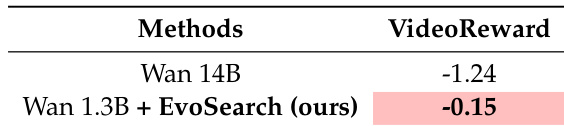 The authors evaluate EvoSearch on video generation tasks using the Wan 1.3B and Wan 14B models, with VideoReward as the guidance metric. Results show that Wan 1.3B enhanced with EvoSearch achieves a significantly higher VideoReward score compared to the larger Wan 14B model, demonstrating that EvoSearch enables smaller models to outperform larger ones under equivalent inference time.