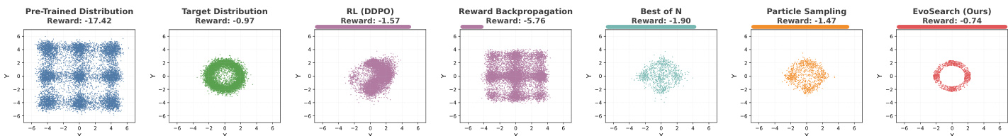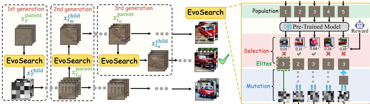 - EvoSearch introduces a generalist TTS framework that reformulates denoising as an evolutionary search process, using denoising-aware selection and mutation mechanisms to iteratively improve sample quality while preserving diversity across diffusion and flow models.