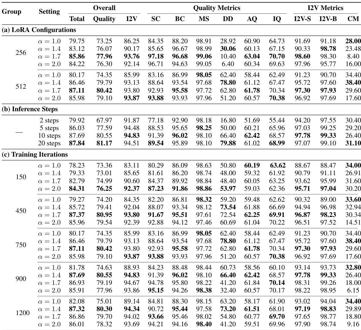 Results show that the model achieves optimal performance with a LoRA rank of 512 and an alpha of 1.7, as higher ranks consistently improve quality across metrics. The model converges rapidly, with peak performance reached at 900 training iterations, and further training leads to diminishing returns. Inference quality improves significantly up to 10 steps, after which gains become marginal, indicating that 10 steps provide the best balance between speed and output quality.