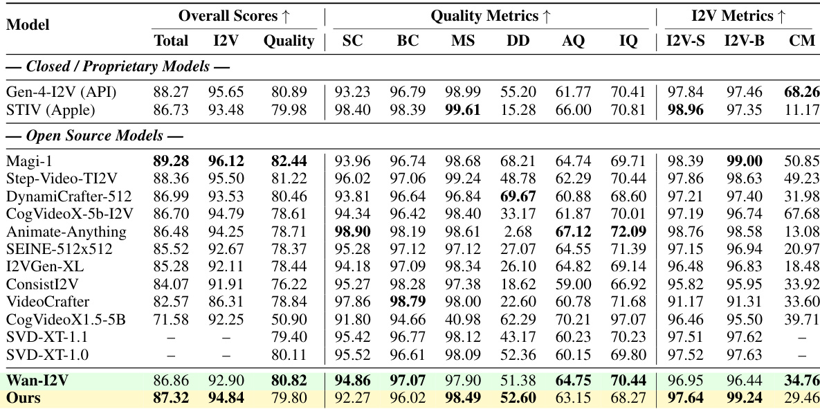 Results show that the proposed model achieves a total score of 87.32, surpassing the Wan-I2V baseline's 86.86, while using less than 1/2500th of the training data and 1/200th of the computational cost. The model demonstrates superior performance in key metrics, including I2V Background Consistency (99.24 vs. 96.44) and I2V Subject Consistency (97.64 vs. 96.95), indicating strong adherence to the input image condition.
