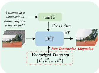 The Pusa model is implemented by adapting a pre-trained text-to-video (T2V) diffusion transformer, specifically a DiT (Diffusion Transformer) architecture. The key architectural modification, termed Vectorized Timestep Adaptation (VTA), re-engineers the model's temporal conditioning mechanism. Instead of processing a scalar timestep t, the model processes the vectorized timestep τ. This is achieved by modifying the timestep embedding module to generate a sequence of frame-specific embeddings Eτ. These embeddings are then projected to produce per-frame modulation parameters (scale, shift, and gate) for each block of the DiT architecture. This allows the model to condition the processing of each frame's latent representation zi on its individual timestep τi, enabling the model to handle a batch of frames at different points in their generative paths simultaneously. This adaptation is non-destructive, preserving the base model's T2V capabilities.