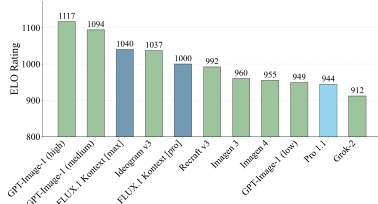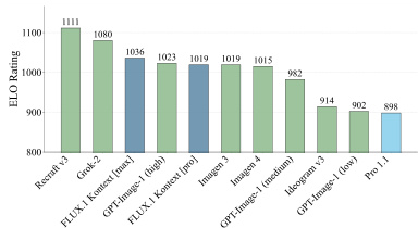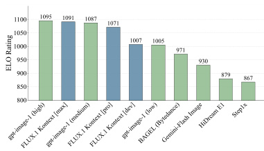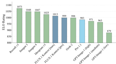 Results show that FLUX.1 Kontext [pro] achieves the highest ELO rating among the evaluated models, outperforming competitors such as GPT-Image-1 and Recraft-3 in the benchmark. The authors use this ranking to demonstrate the model's superior performance in image generation and editing tasks, particularly in maintaining consistency and quality across diverse inputs.
